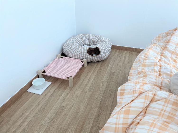침대 아래에 공간이 남아서 고양이들 용품을 뒀습니다. 고양이 터널과 고양이 해먹, 물그릇이 있어요. 터널 중간에는 방석이 있어서 고양이들이 들어가서 잠도 잡니다. 고양이들이 은근히 사람을 따라다녀서 사람이 침대에 누워있으면 고양이들도 침실에서 각자 자리를 잡아요. 그래서 라탄 하우스 말고도 고양이들이 잘 수 있는 공간을 또 마련해 줬어요.