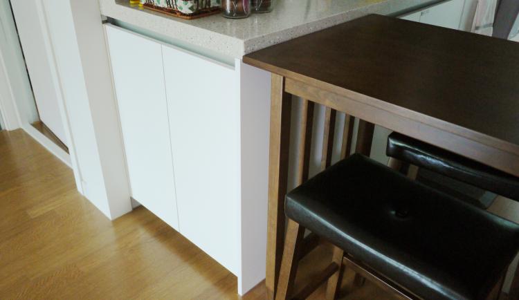 수납공간을 위해 길게 낸 하 부장의 식탁 부분은 쉽게 사용할 수 있도록 측면에 문을 달아주었어요. 이곳에 저희 집 냄비랑 커피 등등 잡다한 물건이 다 들어간답니다 :-)