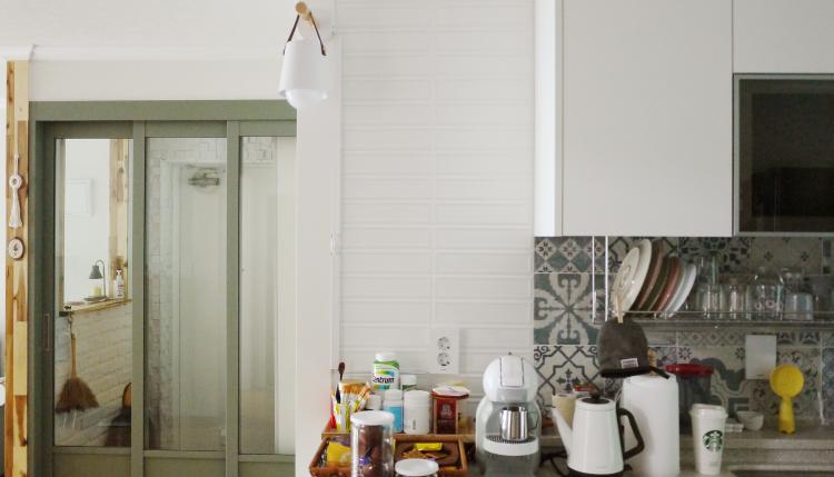 부엌 타일은 식탁이 있는 부분과 싱크대가 있는 부분으로 구분을 해주기 위해 다른 종류의 타일을 배치했어요. 식탁 쪽은 깔끔하게 모던한 화이트 타일로 꾸며주었고, 싱크대 쪽은 스페인 타일로 에스닉한 문양이 뒤죽박죽 섞여있는 게 포인트에요.