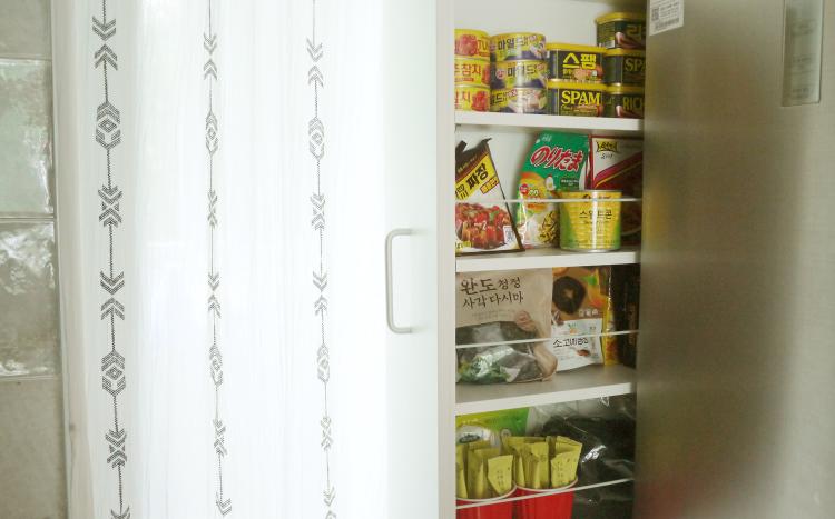 좁은 부엌에는 수납이 제일 중요하지요. 수납을 위해서 슬라이딩 틈새 수납장을 두어 통조림이나 전 식품을 보관하고 있어요. 냉장고 옆 20센티만 있으면 수납공간이 생겨서 너무나 유용하게 쓰고 있답니다.
