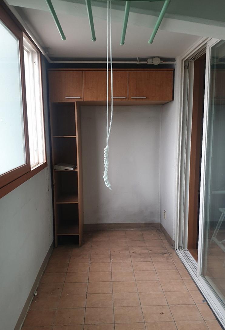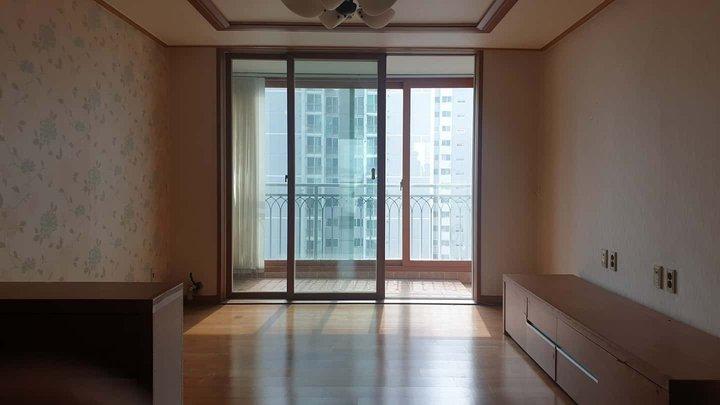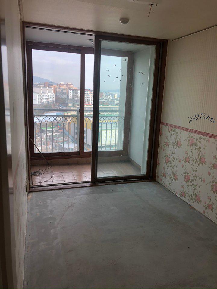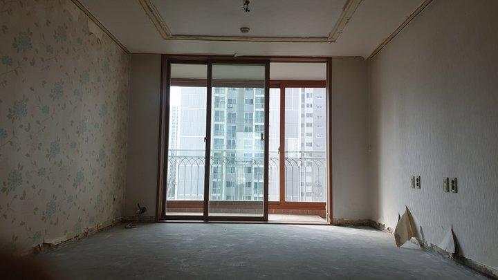 저희 집 거실이에요. 16년 동안 한 번도 수리 안 된 집이었어요. 확장도 안 되어 있었지만 개인적으로 베란다를 좋아해서 그 점이 마음에 들었어요.