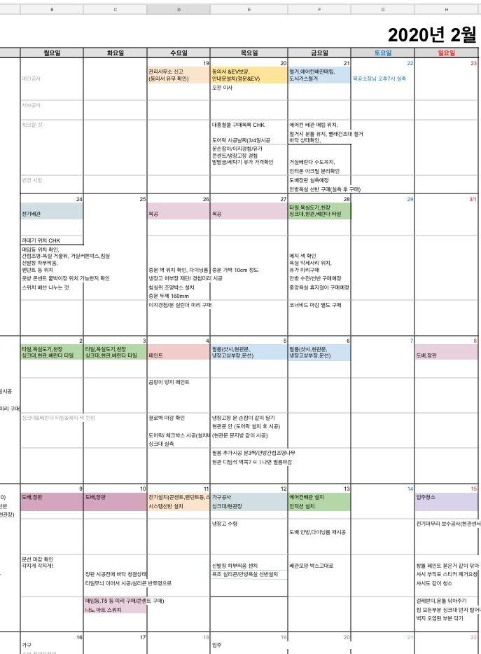 시공자분들 섭외할 때 일정이 겹치면 안 되고 또 다음 일정에 차질이 없게 다음 공정을 위한 밑 작업, 자재들을 꼼꼼히 체크하기 위해서 일정표를 만들어 수시로 업데이트하면서 공사 일정을 진행했습니다.