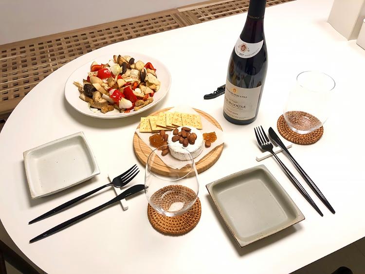 반셀프 인테리어 하고 수고한 우리 부부의 노고를 축하하며 샴페인을 한잔하기도 하고 가끔 기분 좋은 날은 이렇게 와인과 안주를 먹으면서 그날의 분위기를 즐기기도 하고요.
