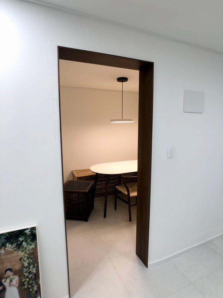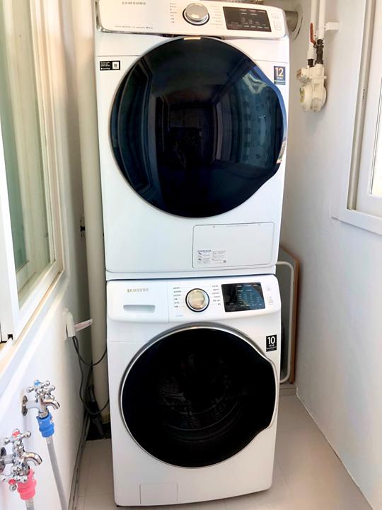 주방 베란다 맞은편에는 세탁기와 건조기를 직렬로 설치했어요. 그 대신 다이닝룸 창문이 가려지지 않도록 최대한 뒤쪽으로 설치해서 세탁기 앞쪽에 공간도 확보하고 다이닝룸 조도도 해치지 않게 했어요 건조기는 제가 살면서 산 가전 중 제일 잘 샀다고 자부하는 가전이에요. 건조기를 쓰기 전까지는 딱히 필요 없다고 생각했었는데 사용해보니 이제 건조기 없는 삶으로는 못 돌아갈 것 같아요. 그 정도로 만족도가 높은 가전이에요.