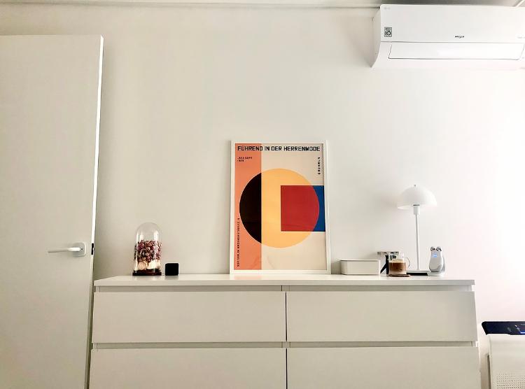 침대 맞은편에는 서랍장을 둬서 화장대 겸 수납장으로 사용하고 있습니다. 조명과 바우하우스 포스터를 올려둬서 부족한 색감을 채워주고 있어요.