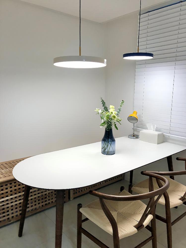 주방 맞은편 다이닝 룸이에요. 워낙 좁은 면적이기도 하고 주방에 식탁을 놓기 애매해서 다이닝룸 역시 과감하게 문을 생략하고 식탁으로만 다이닝룸을 완성시켰어요. 밥을 먹기도 하지만 노트북을 하거나 각자 취미생활을 하는 다목적 룸이기도 해요.