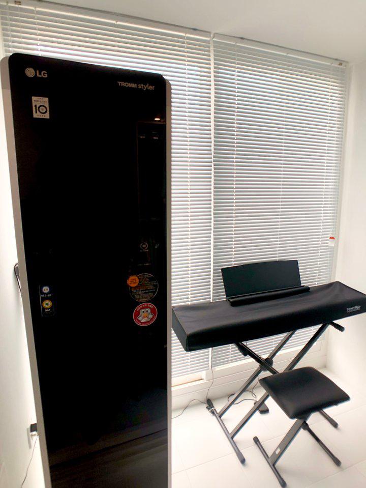 드레스룸 베란다에는 스타일러와 키보드를 뒀어요. 남편이 정장을 입고 출퇴근해서 스타일러는 저희 부부에게 필수품이 되었어요. 키보드를 딱히 놓을 곳이 마땅치 않아서 이곳에 두고 가끔 기분 내고 싶을 때 연주하곤 합니다.