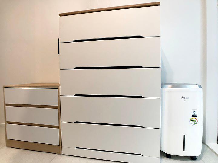 시스템 선반 맞은편에는 기존에 쓰던 서랍장을 그대로 사용하고 있어요. 사실 인테리어 하면서 모든 가구를 바꾸고 싶었지만 너무 멀쩡해서 그대로 쓰고 있어요. 그리고 여름에 필수 가전인 제습기도 이곳에 보관하고 있어요. 장마철이나 습도가 높은 날에는 제습기만 한 가전제품이 없다고 생각해요. 제가 산 가전제품 중 정말 만족하는 가전 중 하나에요.