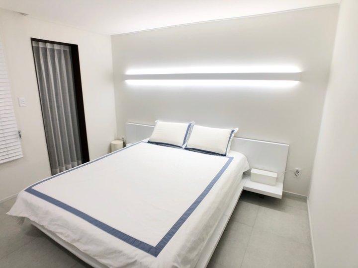 저희 집 침실은 간결하면서도 심플해요. 침실에는 침대만 있는 게 좋아서 침대와 간접조명 박스를 설계해서 다른 가구 없이 꾸몄어요. 자칫 너무 심심하게 느껴질 거 같아서 간접조명을 침대 헤드길에 맞춰서 시공해 놓으니 조명하나 만으로도 포인트가 되더라고요.