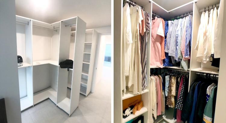 시스템 선반 처음 시공했을 때 사진이에요. 이렇게 E자형로 시스템 선반을 시공해서 수납력을 최대치로 끌어올렸어요. 저희 집은 천고가 낮아서 기존 브랜드 붙박이장이 설치 불가 더라고요. 그래서 생각해낸 게 시스템 선반이었는데 붙박이장 보다 깔끔한 느낌은 덜 하지만 수납은 훨씬 많이 돼서 만족해요.