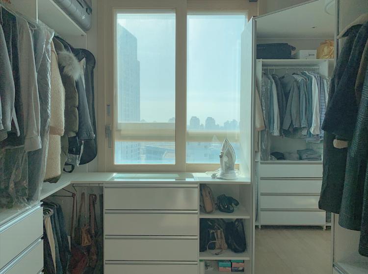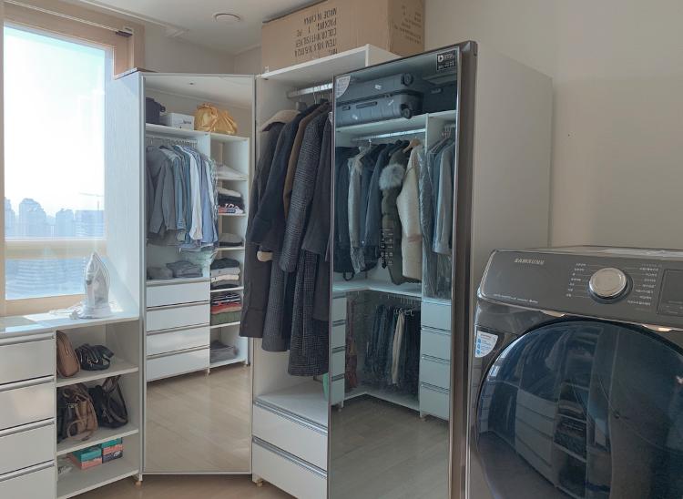 오른 편에는 에어 드레서와 건조기가 위치해있습니다. 건조기는 다용도실 공간이 되지 않아 드레스룸에 두었어요. 처음에는 편의성이 떨어질까 걱정했는데 막상 사용해보니 마른 옷을 바로 꺼내 정리해서 넣어놓을 수 있다는 점이 좋아요.
