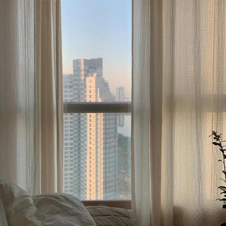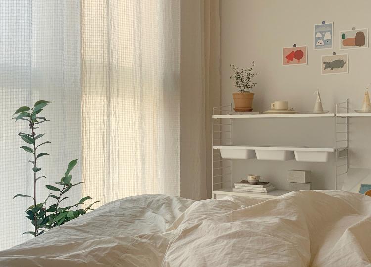 거실에는 베이지색 상의 코튼 커튼을 달았어요. 침실의 분위기와도 잘 어울리고 침구 색상과도 잘 어울려요. 시폰 커튼보다 코튼 커튼이 따뜻하고 아늑한 느낌을 더해주는 거 같아요.