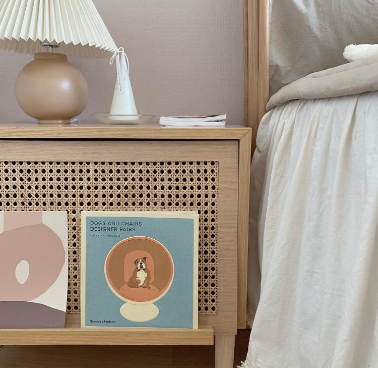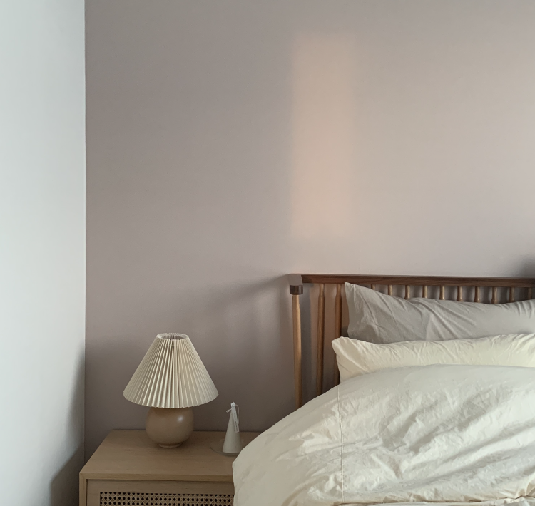 침실은 따뜻하고 아늑한 느낌으로 구성했어요. 침실에 들어서면 보이는 벽면은 은은한 핑크 베이지 색상의 벽지로 포인트를 주었어요. 편안하고 아늑한 느낌을 원했던 만큼 우드 소재와 베이지 색상의 가구와 소품, 패브릭 등을 사용했어요.