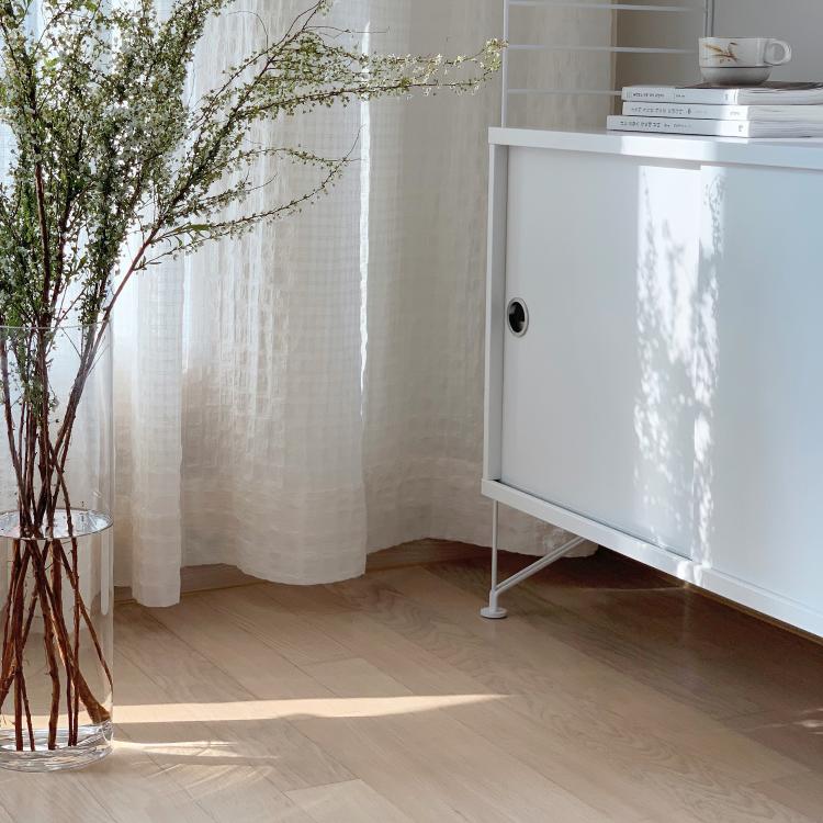 침대 맡은 편 벽면에는 스트링 시스템을 설치했어요. 안방 분위기와 어울리고 소품들을 살려줄 수 있는 화이트 색상을 선택했어요. 식물과 캔들, 이것저것 오브제들을 올려놓으니 제자리를 찾은 것처럼 잘 어울려요.