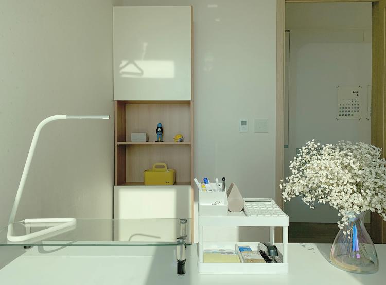 서재는 화이트 컬러로 통일했어요. 책상은 두 명이 앉아 사용하기에 적당히 큰 사이즈를 구입했어요. 맞은편에는 최소한의 수납장만 두고 사용 중이에요.