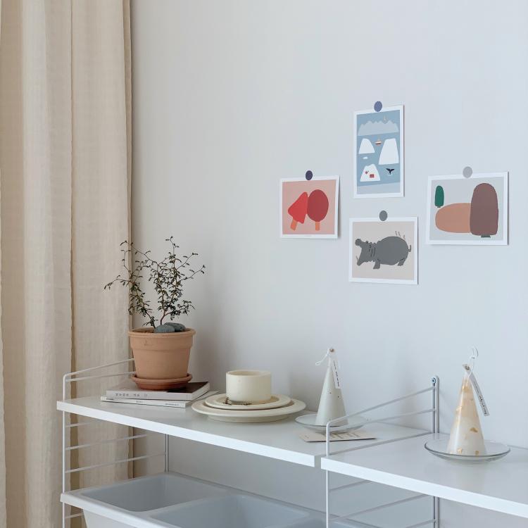 단조로움을 조금 덜어주기 위해 컬러감이 있는 엽서도 벽에 붙여놓고 식물들도 가져다 놓았어요.