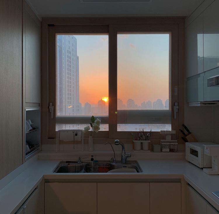 해 질 녘 주방 노을 뷰에요. 커다란 해가 지는 모습을 부엌에서 볼 수 있다는 점이 이 집의 또 하나의 매력이에요.