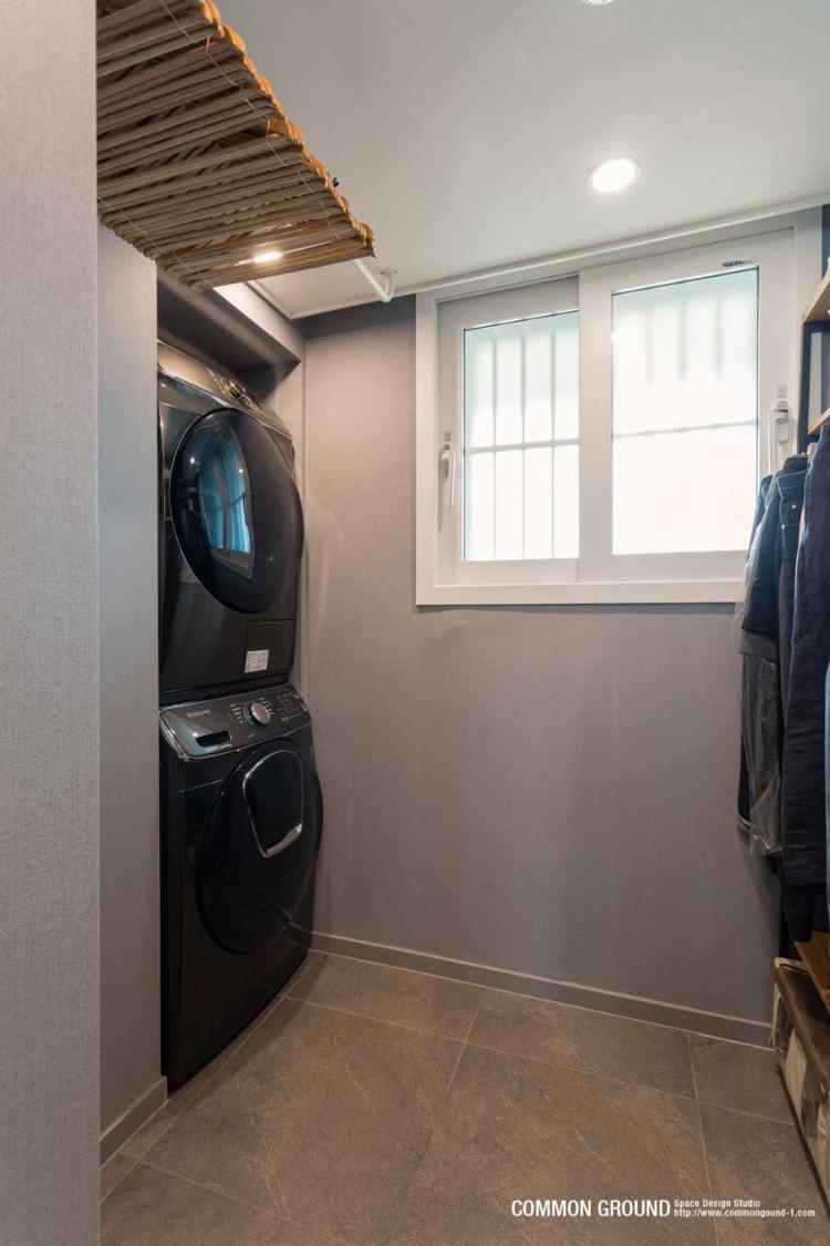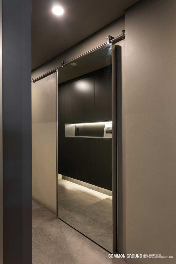 석재타일의 무거움을 덜어주기 위해 스테인레스 금속 슬라이딩 도어를 선택했습니다. 가전들과 조명의 소재를 스테인레스로 통일해 전체적으로 시크한 느낌에 포인트가 되어주고 있네요.