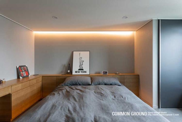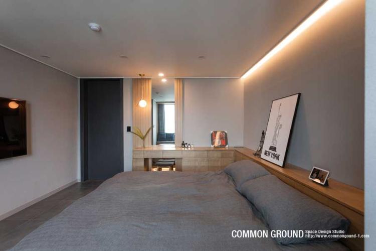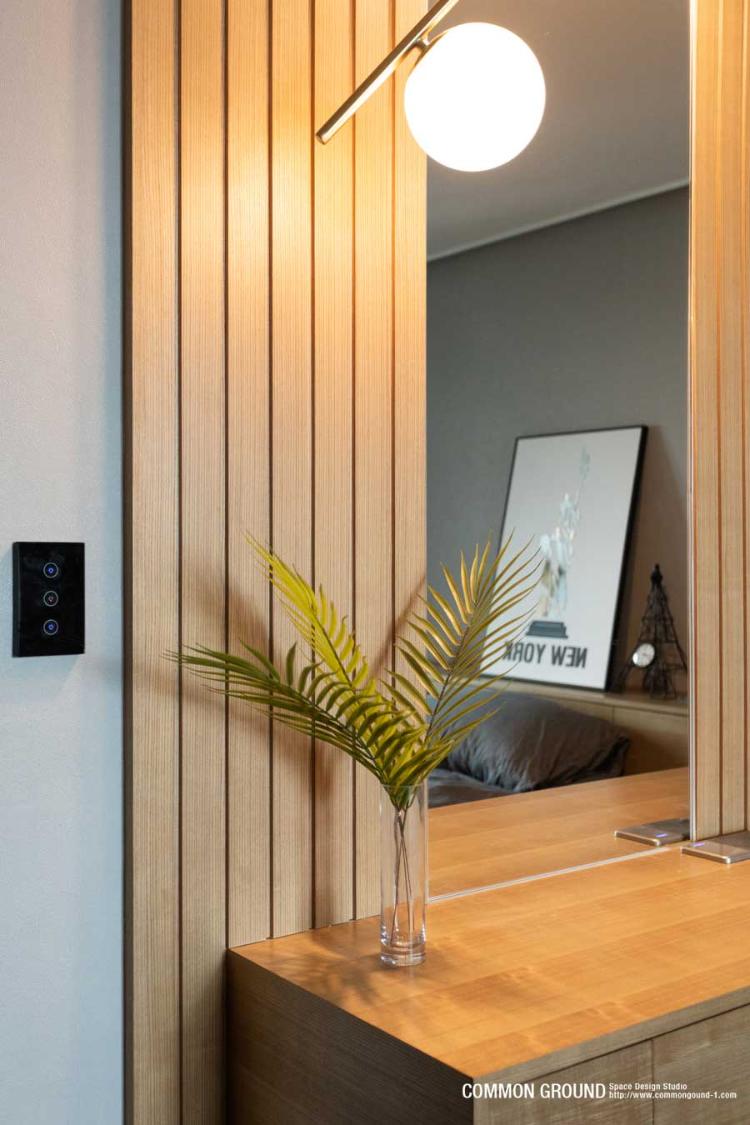 커먼그라운드의 제작가구로 채워진 안방의 모습입니다. 화장대, 침대, 침대헤드, 데이배드 모두 우드톤으로 통일되어 안정감이 느껴지고 편한한 느낌이 드네요.