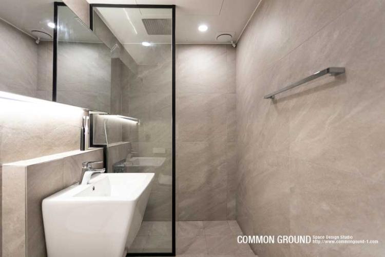 하나의 타일로 조성한 욕실의 모습입니다. 천정매입형 레인샤워를 통해 호텔식 욕실로 연출했습니다.