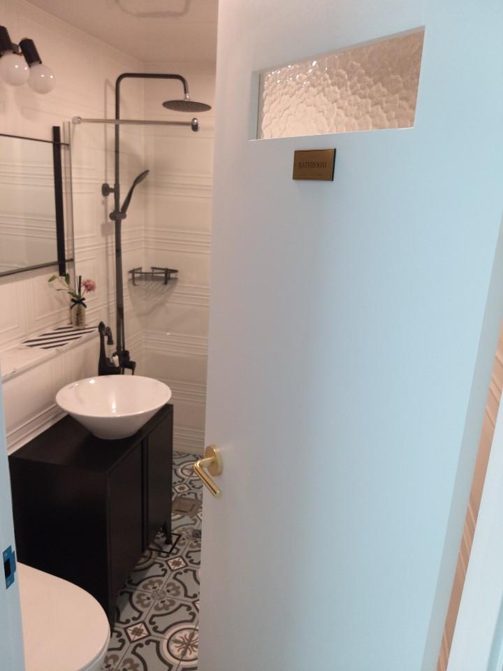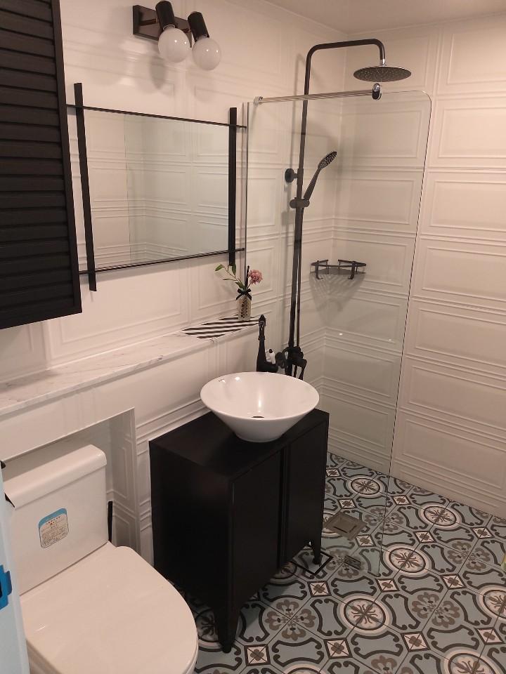 처음에 인테리어 공사할 때 안방과 공용화장실 액세서리는 제가 다 구입하겠다 해서 흔쾌히 허락받고 진행했는데 …. 모든 걸 다 배달 받고 정리하는 것도 너무나 힘들더라고요 ㅠㅠ 그래도 제 생각대로 북유럽 느낌의 캐주얼한 욕실이 탄생되어 줘서 너무 좋았어요. 참고 바닥 타일은 저희 큰아들이 골랐답니다 ^^