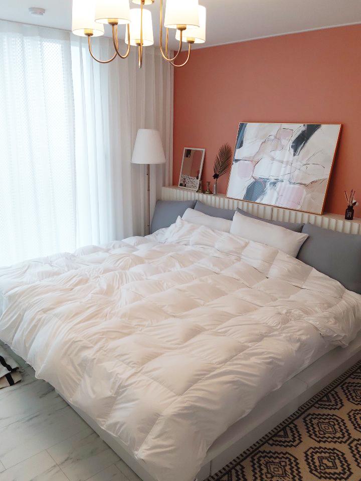 핑크를 너무나 좋아하는 저에게 남편이 청천벽력 같은 어명을 내립니다. 다른 곳엔 핑크 절대 안 돼! 안방만 해 …라고 해서 안방에 조금의 망설임도 없이 포인트를 주었어요. 저 침대 헤드는 제가 1주일간 고생하며 만든 아이에요.