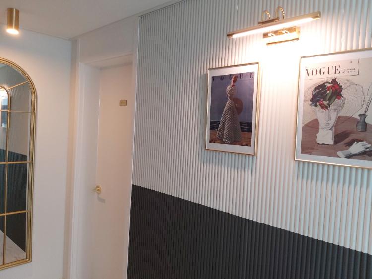 여긴 제방을 나와 복도 모습이에요. 저 옆에 살짝 보이는 골드 아치 거울은 3달을 기다려 받았지만 그 기다림도 한 번에 날려줄 만큼 이쁜 아이랍니다. 그리고 저희 집 포인트는 템바 보드인데요. 차콜과 화이트 반반씩을 써서 더욱 고급스럽게 연출해봤어요. 거기다 보그 액자가 한몫해 주네요 ^^