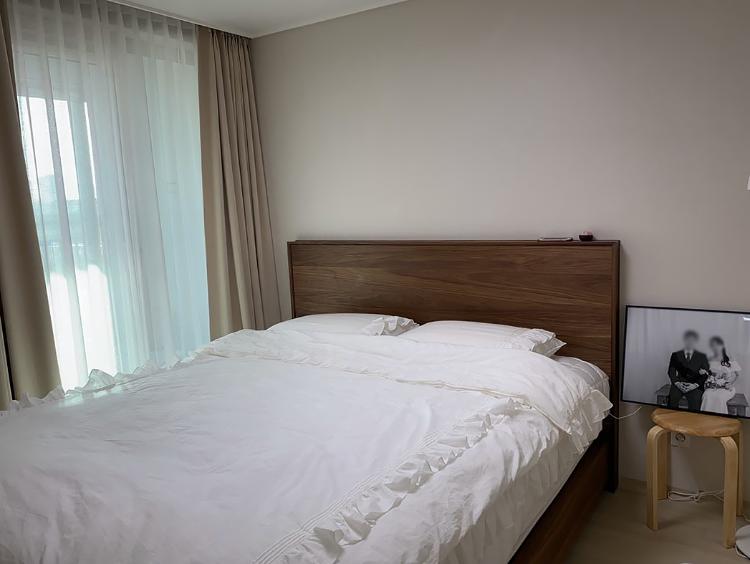 수면을 취하기 위해 안방에는 침대만 놓자고 생각했는데, 어차피 안방에는 침대 하나만 놓을 수 있는 크기였어요. 침대야 무조건 들어가겠지 하고, 방 크기 생각도 안 하고, 무턱대고 슈퍼 킹 침대를 구매했는데, 정말 까딱하다간 문이 안 닫힐뻔했지 뭐예요. 설치해 주신 기사님도 여기는 이 구조가 최선이라는 말만 하고 가셨어요.ㅎ