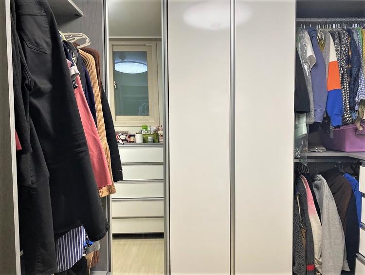 붙박이장이 없기에, 옷이나 이불은 모두 여기에 수납할 수 있도록 ㄷ자로 모두 시스템 장을 짜 넣었어요. 센치를 재고 도안을 짜는데 머리에 쥐가 날 뻔했지만 제가 짠 도안대로 드레스룸이 완성되어 너무나 만족합니다. 워낙에 유명한 업체이다 보니 오래 걸릴 줄 알았는데, 저희 집 가장 먼저 완성된 곳이에요.