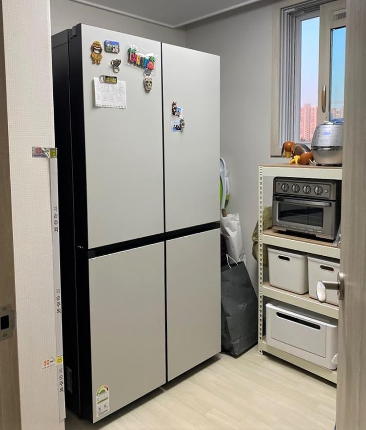마지막 남은 방을 냉장고방으로 부른답니다. 이 냉장고의 위치를 두고 갖은 고민을 다했던 것 같아요. 집 크기에 맞추어 냉장고를 사고 싶진 않았어요. 일 이년 사용할 냉장고도 아닌데, 제가 사고 싶은 냉장고를 사고 싶었어요. 이 큰 냉장고를 주방에 놓았다면 튀어나오고, 좁아 보이고, 답답해 보일 것 같았죠. 그래서 가장 작은방을 냉장고에 넣기로 했답니다. 그리고 이왕 주방과 거실을 넓게 사용하기로 했으니 이방은 펜트리처럼 만들어 소형 가전제품을 모두 여기에 놓게 되었답니다. 냉장고 설치기사님이 이 행복주택에 냉장고를 방에 놓는 사람은 처음이라고 하셔서 또 고민이 되었지만 이미 큰 냉장고가 배송 왔으니 계획대로 방에 넣었어요.