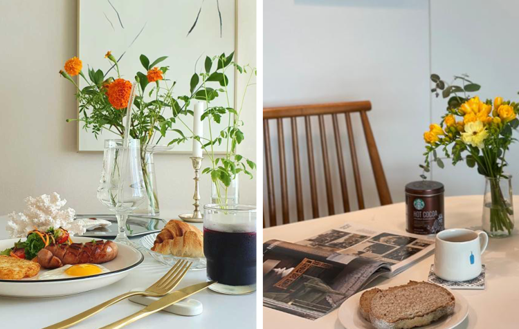 풍성한 꽃이 테이블 위의 음식을 한층 활기차게 만들어주는 것 같아요!
