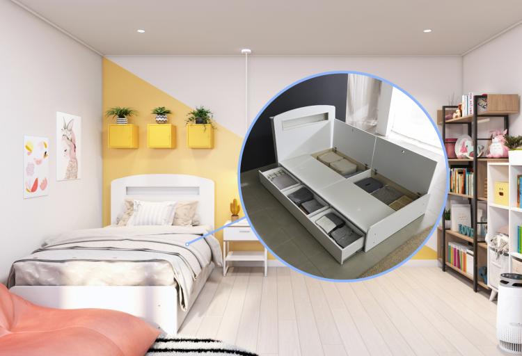 아이의 물건으로 가득한 아이방은 수납공간을 최대한 늘려주고 잘 활용하는 게 가장 중요해요. 그래서 수납 침구를 선택하게 되었는데 공간 효율성이 높아서 훨씬 깔끔한 정리가 가능해요~