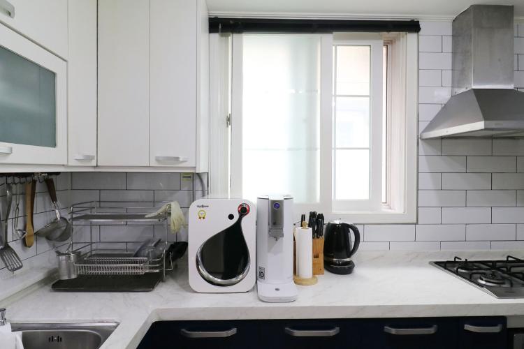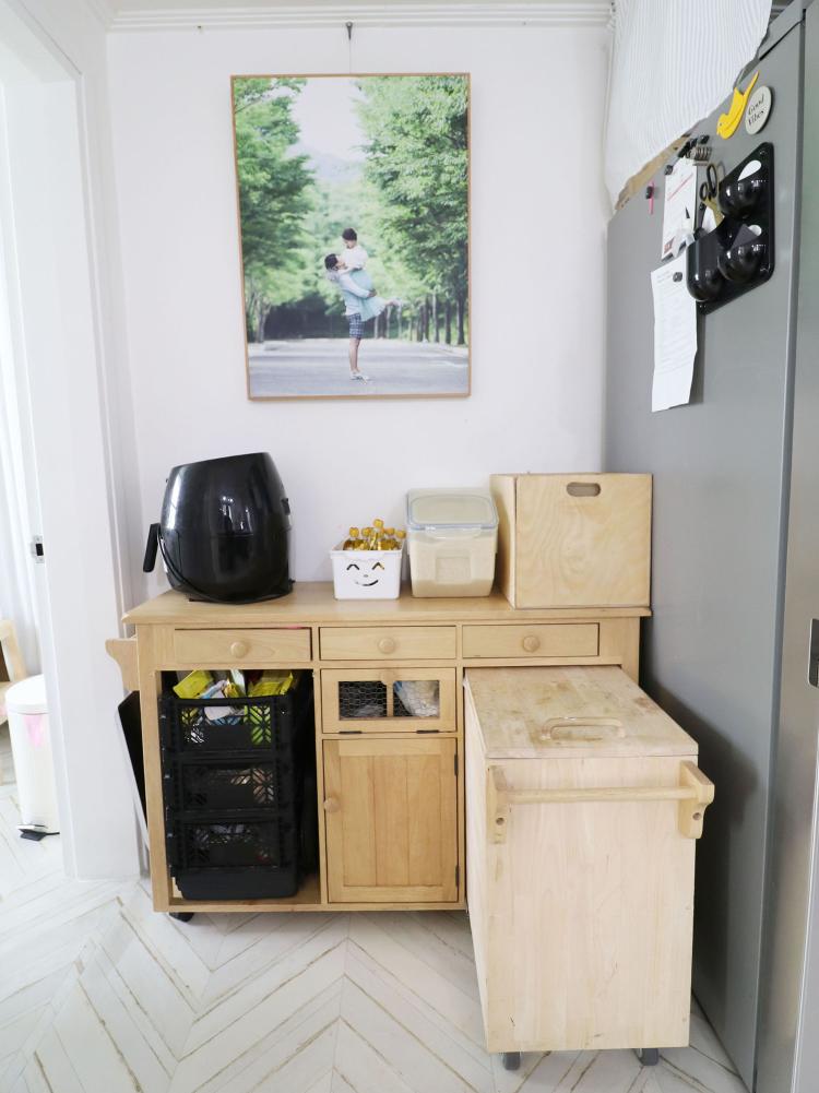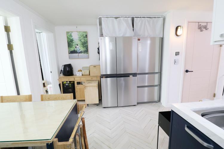 구조가 조금 난해해서, 냉장고는 부득이하게 싱크대 반대편으로 놓아야 했고요. 초보 주부일 때는 냉장고 문 열리는 것을 고려하지 못해서 메탈 컬러만 맞춰서 김치냉장고, 냉장고 구입해서 일직선상에 못 두는 치명적인 결함이 생겼는데 다음 냉장고 구입엔 비스포크 키친 핏 등 외형의 디자인도 좀 더 고려할 것 같아요.
