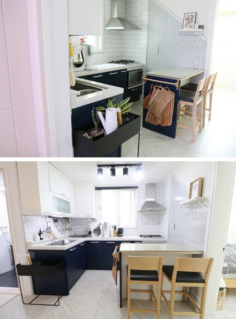 저희 집 주방은 이렇게 사용 중이에요. 바닥교체와 네이비 컬러는 신의 한 수였던 것 같아요. 조리대를 깔끔하게 다 비우고 싶어서 아일랜드장을 만들었어요.