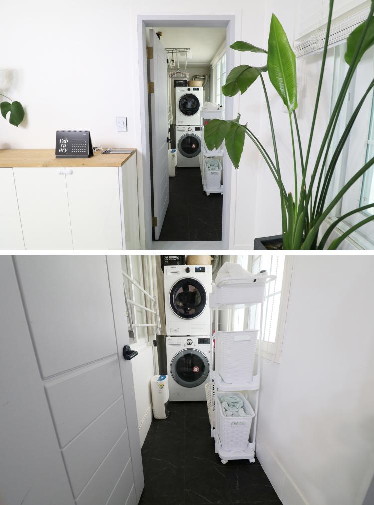 바닥은 데코타일을 붙이고 벽면은 화이트로 셀프 페인팅으로 정돈을 했답니다. 바닥은 장판처럼 관리를 하고 맨발이나 실내화를 신고 다니면 돼서 편리하답니다. 그리고 건조기를 들인 후에 집안일이 줄어서 참 좋아요. 저는 9Kg을 구입했지만 요즘 나오는 용량 큰 제품이 탐난답니다!