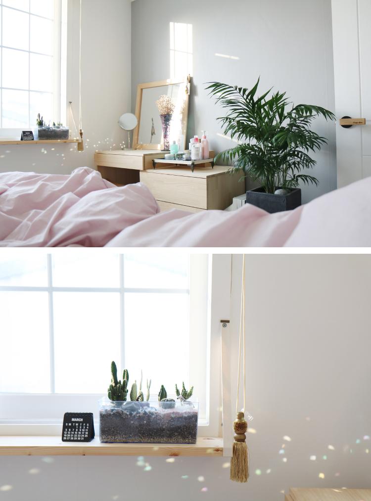 구스 솜에 이불 커버와 침구는 기분에 따라 바꿔가며 쓰는 편인데 핑크 컬러가 침실을 더 로맨틱하게 보이게 하는 것 같네요.