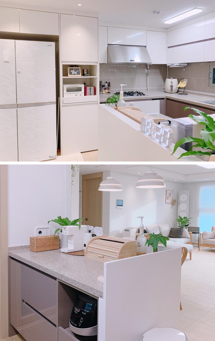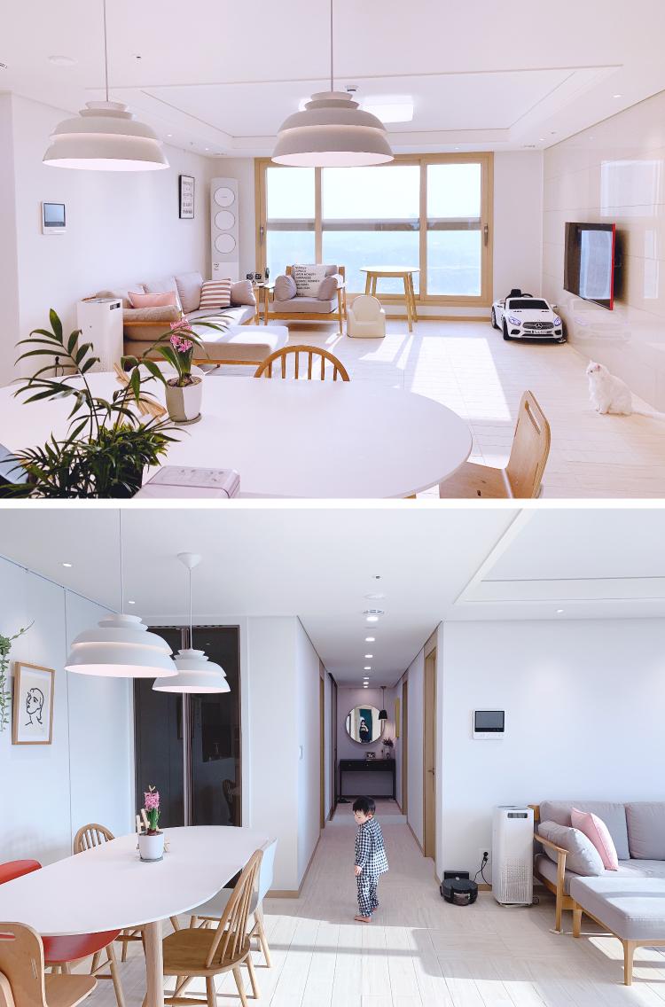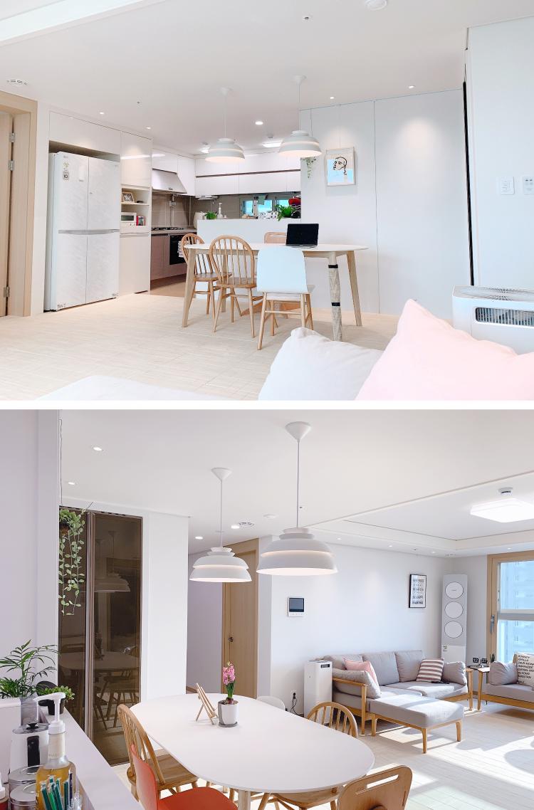 제가 여러 구조의 아파트를 많이 살아봤는데 개인적으로 판상형 구조가 제일 살기 좋은 것 같아요. 방 모두 해가 잘 들고 넓어 보이는 것 같더라고요. 입주를 하기 전에 시공 한 것들은 도배, 조명, 주방 가벽 이었는데요. 모두 직접 발품 팔아 알아보고 작업자를 직접 섭외해서 시공하였어요. 사실 하고 싶은 것은 많았는데 욕심에는 끝이 없더라구요.. 살면서 바꿔나가면 되죠^^