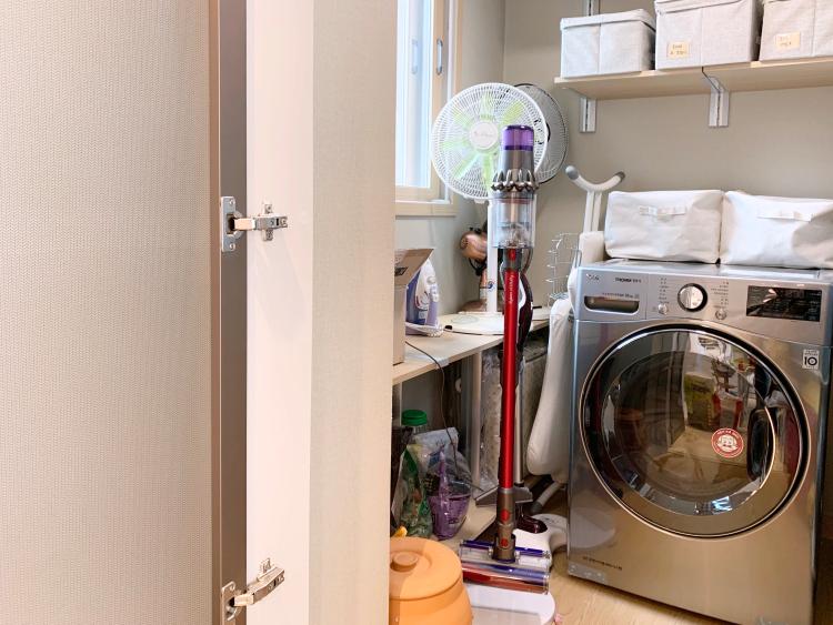 식탁 옆에 저희는 팬트리가 있어요. 여기엔 건조기와 청소도구 등 잡동사니들이 있습니다. 세탁실이 좁아서 어쩔 수 없이 건조기는 여기에 놓았어요. 건조기는 이사오면서 구입했는데 정말 잘 산 가전 중에 하나인 것 같아요. 왜 진작 사지 않았나 후회 할 정도.. 뽀송뽀송 하게 빨래감이 나올 때 너무 기분이 좋아요. 무선청소기 또한 너무 강추하는 아이템! 아이가 있어 바닥이 항상 지저분한데 바로바로 치울 수 있어서 너무 좋더라고요.