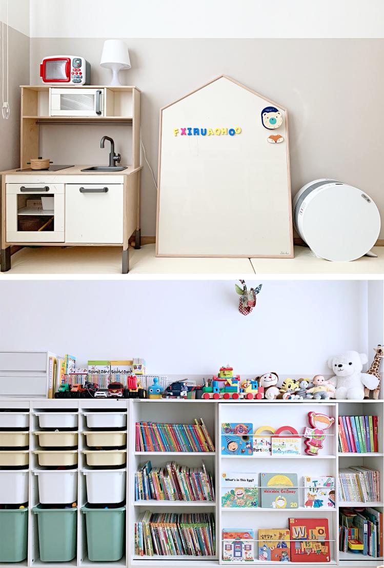 책장 맞은편에는 주방놀이와 자석 칠판이 있어요. 아이방 이다 보니 공기청정기는 필수! 저희는 방마다 공기청정기가 있는 것 같네요.