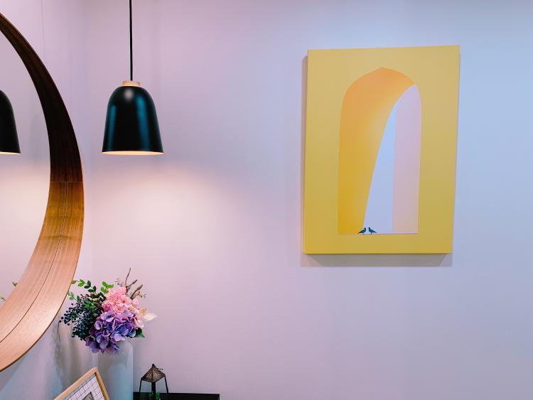 현관으로 들어와 중문을 열고 들어오면 제일먼저 노란 창문 액자가 보입니다. 노란색은 풍수 인테리어 관점에서 복을 부르는 색이라고 하네요. 자세히 보면 작은 새 두 마리가 앉아있는데 부부 새 같아 보이기도 하고 너무 다정해 보여 기분 좋아지게 만드네요.