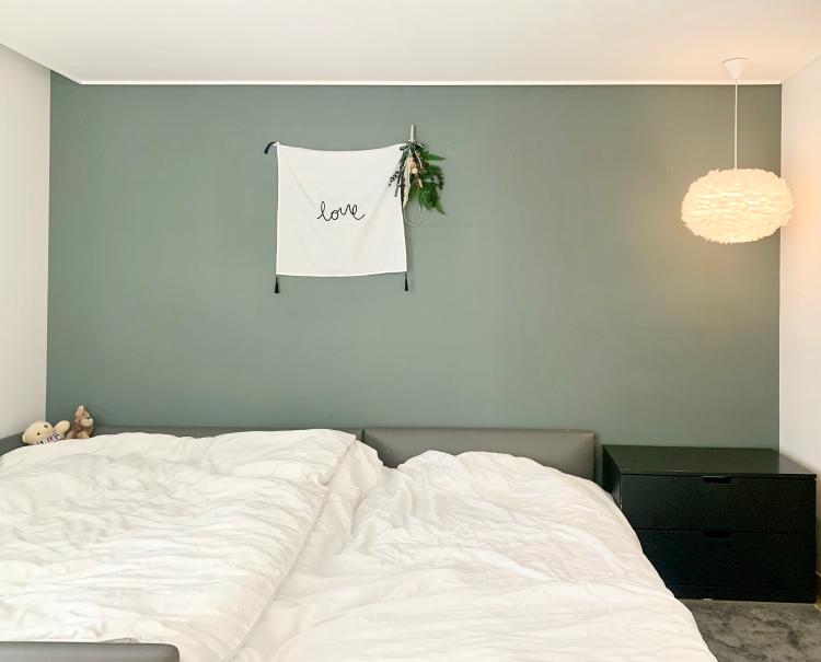 안방은 그린색벽지로 포인트를 줬어요. 사실 제가 원하는 그린색은 아니었는데 (더 진하고 쨍한 그린을 원했음^^) 벽지에서 고르려다 보니 너무 한정적 이더라고요. 나중에 페인트로 색감을 바꿔보고 싶어요~ 그리고 이사오면서 패밀리침대로 바꾸었어요. 아이를 낳고 각방을 썼는데 가족이 다같이 잘 수 있어서 좋은 것 같아요.