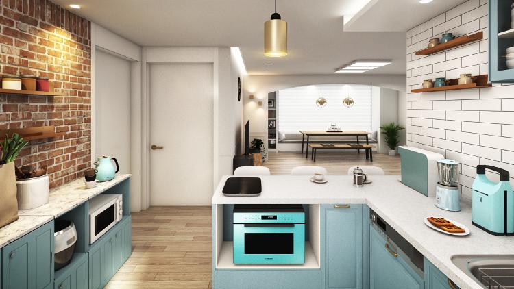 청량함이 느껴지는 민트색으로 포인트를 더한 주방이에요. 민트색은 차분하고 깔끔한 느낌을 주면서도 채도가 높지 않아 무난하게 사용할 수 있는 컬러에요. 한쪽 벽면에는 벽돌로 채워 아늑한 느낌을 더해줬어요.