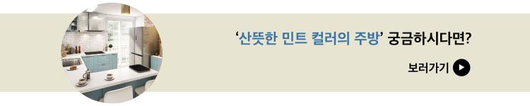 에메랄빛의 그린 톤을 가미해 은은하면서도 시원한 느낌의 주방을 연출했어요. 전체적으로 색감을 통일해 깔끔한 주방의 느낌을 더욱 살려주면서 은은하게 빛나는 대리석&골드 식탁세트로 포인트를 더해줘 세련된 분위기가 물씬 느껴져요.