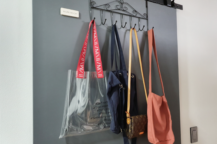 작업실은 미닫이문인데요, 여기에도 문 걸어 이 행거를 설치하고 편하게 들 수 있는 숄더백을 걸어놨어요. 그냥 장 보러 갈 때 자주 드는 녀석들이에요.
