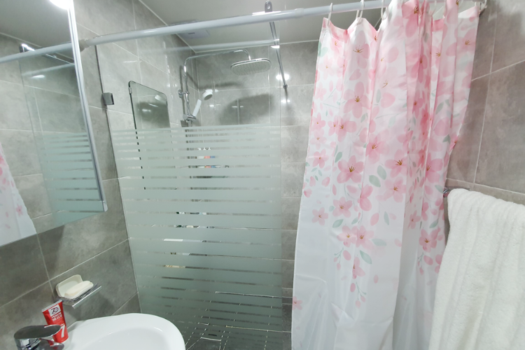 유리벽이 설치되어 있는 샤워실인데요, 유리벽이 있어도 아래쪽이 뚫려있어서 물이 많이 쓸려 올라와요. ㅠ_ㅠ 그래서 샤워커튼 달았어요.