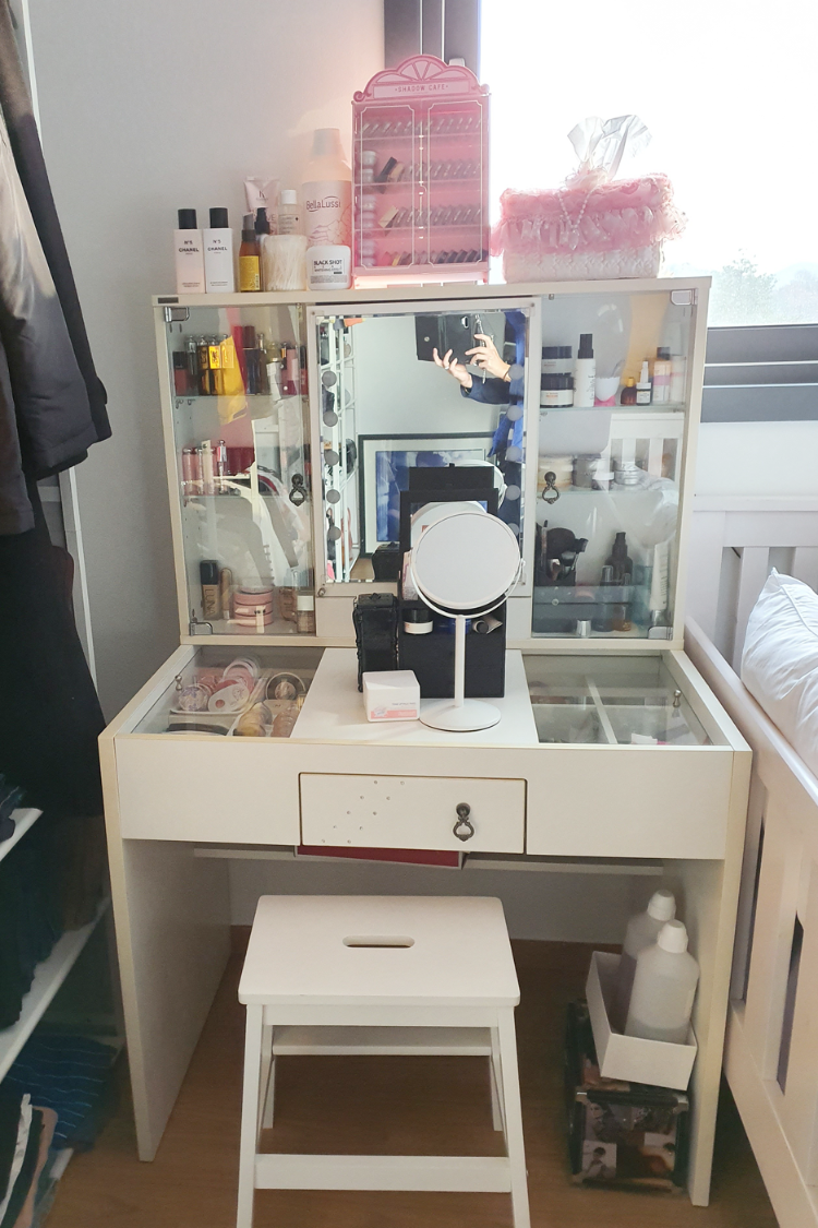 그리고 그 옆엔 화장대가 자리하고 있어요. 의자는 이케아 스텝스툴 화이트!
