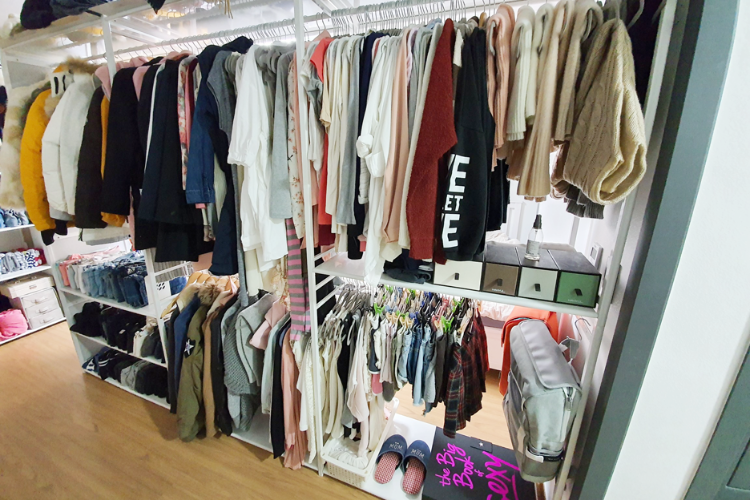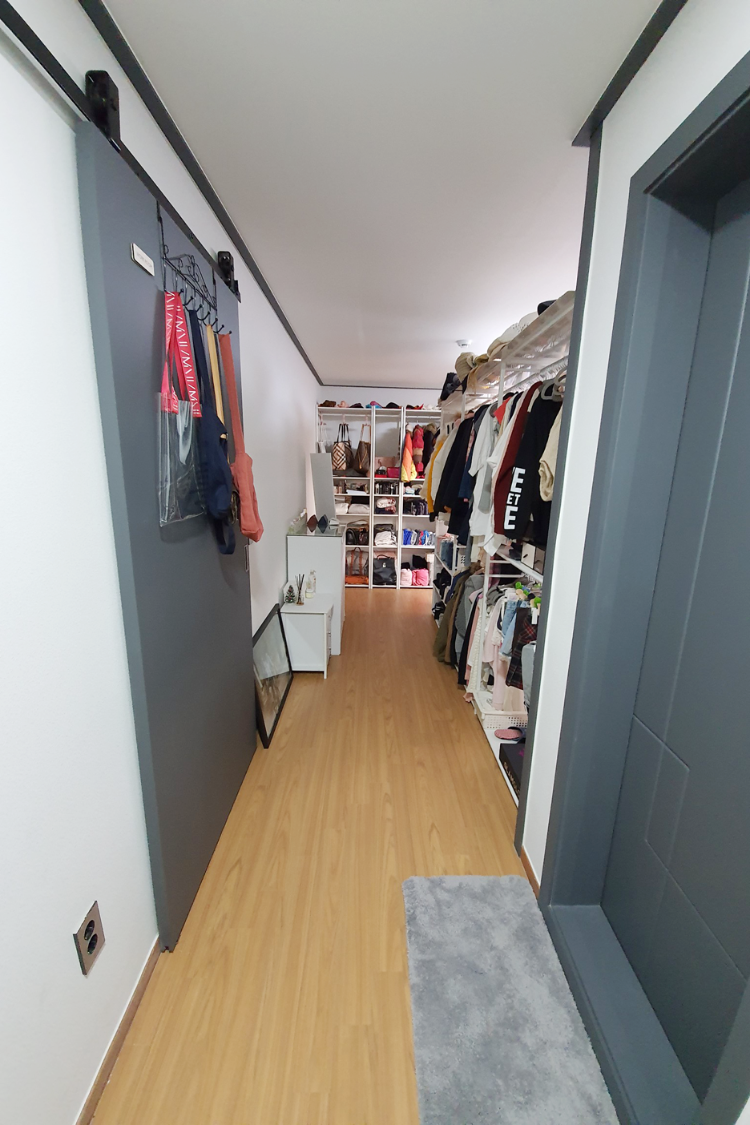 벽을 따라서 왼편으로 쭉 드레스룸이 이어져있어요. 중간부터 끝까지는 전부 K군 옷이에요.