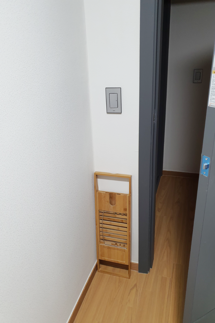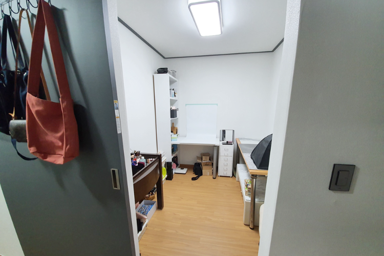 여기까지 와서 뒤돌아보면 요렇게 화장실과 작업실, 안방 문이 보여요. 기다란 통로처럼 해놨어요. 그러니까 왼쪽 보이는 드레스룸 장비 가벽 역할을 하는 셈이죠!