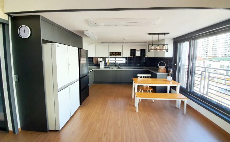 '주방이에요. 길게 일자로 주방이 있고 양옆으로 짧은 주방이 있답니다. 왼쪽엔 냉장고와 김치냉장고가 있고요, 오른 편엔 식탁이 있어요.