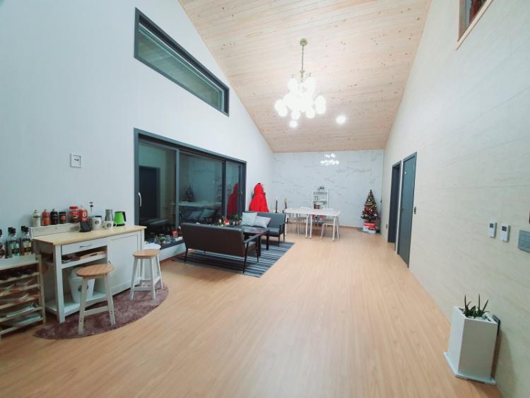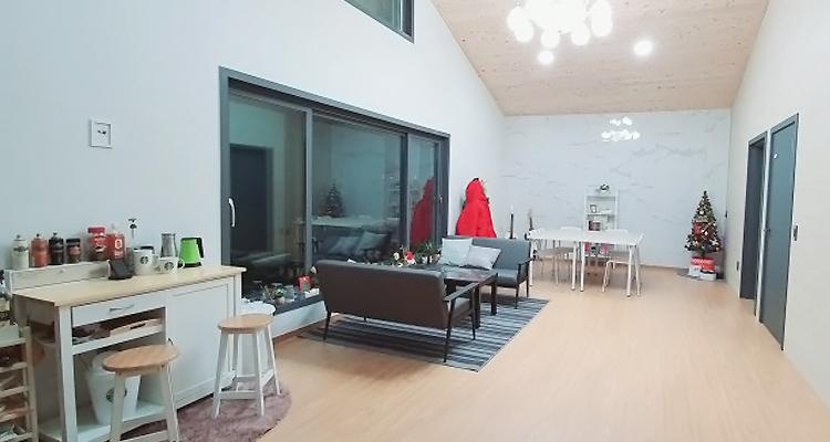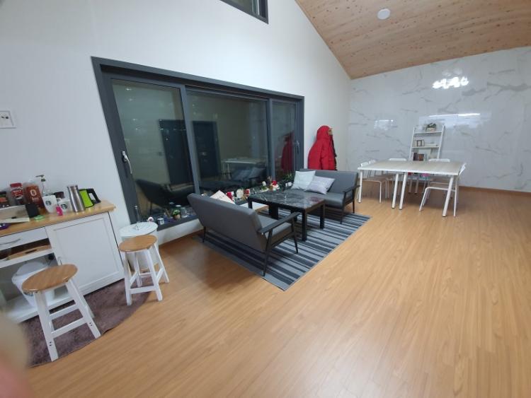 가장 좋아하는 거실이에요. 홈카페가 있고 쇼파 2개, 그리고 테이블이 있어요. 전체적으로 요런 느낌이에요.강렬한 빨간색 패딩이 눈에 들어오는데 사람 아니에요;; 옷걸이입니다. 패딩이 부하다 보니 사진 찍으면 사람같이 나온 현관을 따라 쭉 복도를 걸어오면 거실이 나와요.